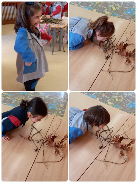 Además, quisimos meternos a fondo en el papel y nos convertimos en cigüeñas, construyendo nuestros nidos con ramas, palos, etc. Experimentamos lo difícil y cansado que puede ser construir los nidos con nuestro "pico" y sin ayuda de nuestras manos (pues tenemos alas).